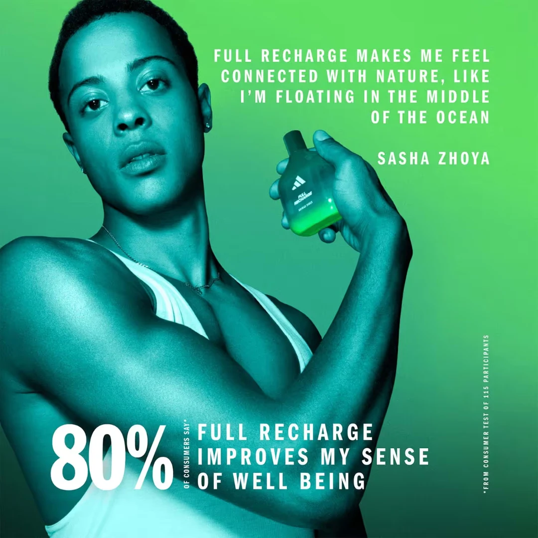 Unleash a burst of positivity with every spritz of the Adidas Vibes Full Recharge Eau De Parfum. This invigorating fragrance is like a breath of fresh air, much like the feeling of freedom of a weekend getaway in nature. Infused with crisp cedar leaf and clary sage and enhanced by basil and sage natural essential oils, it offers a feeling of renewed energy.
