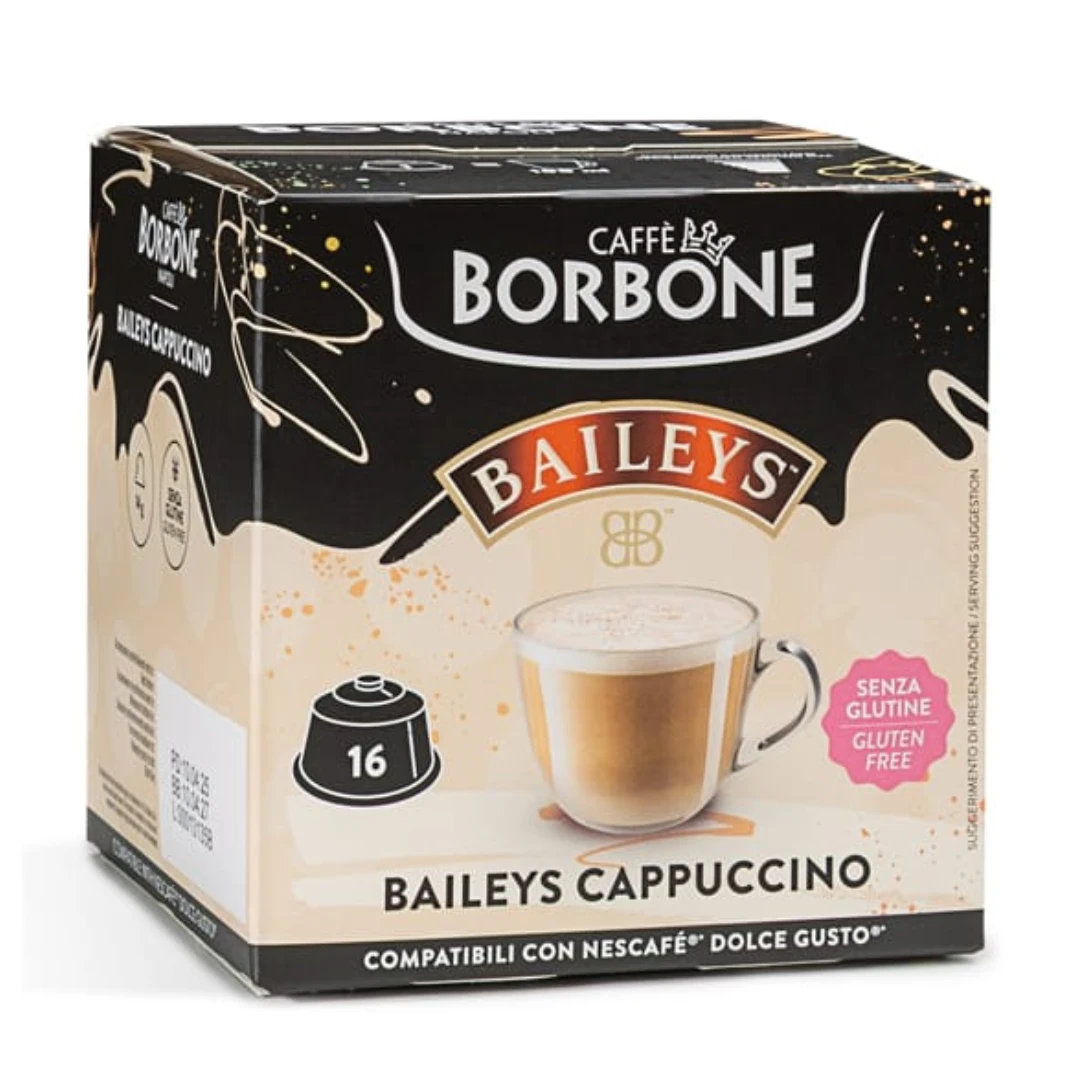 Treat yourself to the popular taste of Baileys Irish cream in a cappuccino, brewed easily with your Dolce Gusto machine. In these pods created by Caffè Borbone you’ll have a cappuccino drink perfectly flavoured with Baileys.