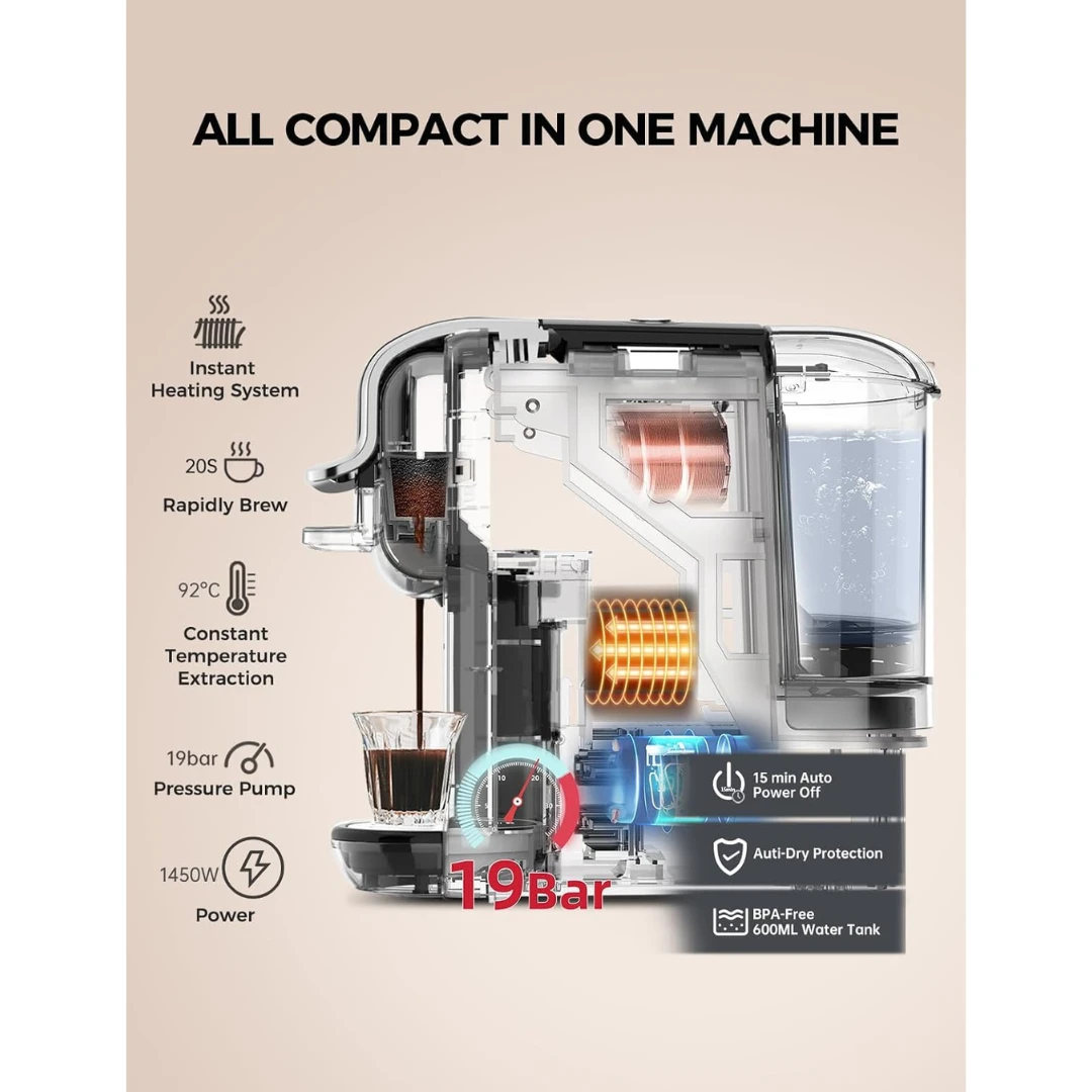 - Features: 19 Bar High Extraction, Adjust Coffee Strength Manually, Dual Extraction System,