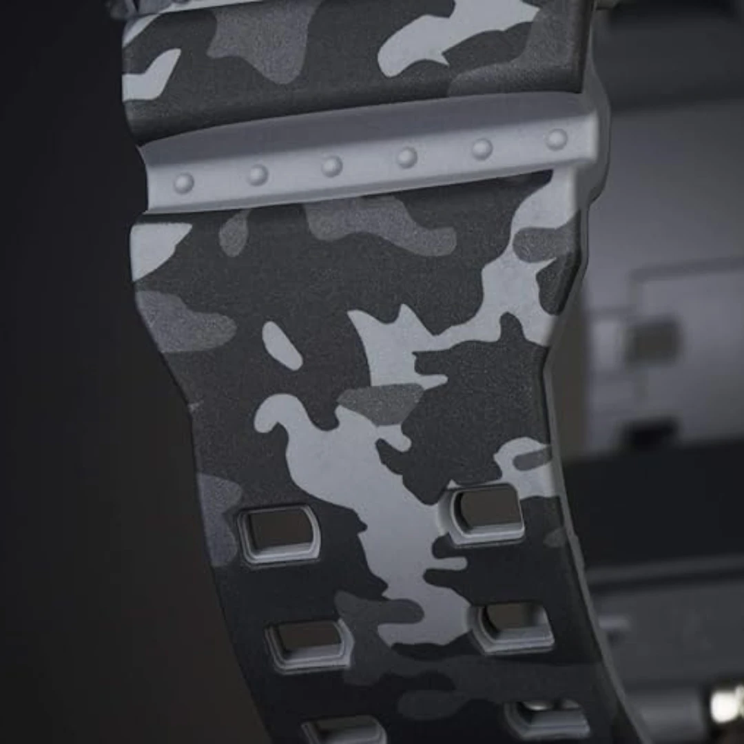 The woodland camouflage pattern of the GD120CM models make these watches perfectly suited to today’s street fashion scene. A new multi-angle printing technology was applied to create the case and band patterns of these models, as well as the camouflage patterns of their dials. GD120CM-8 is a digital watch with gray and black camouflage pattern.