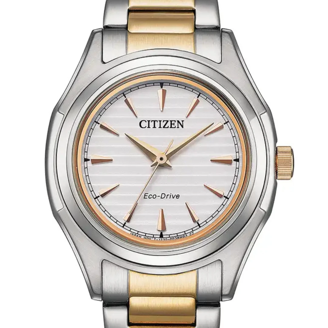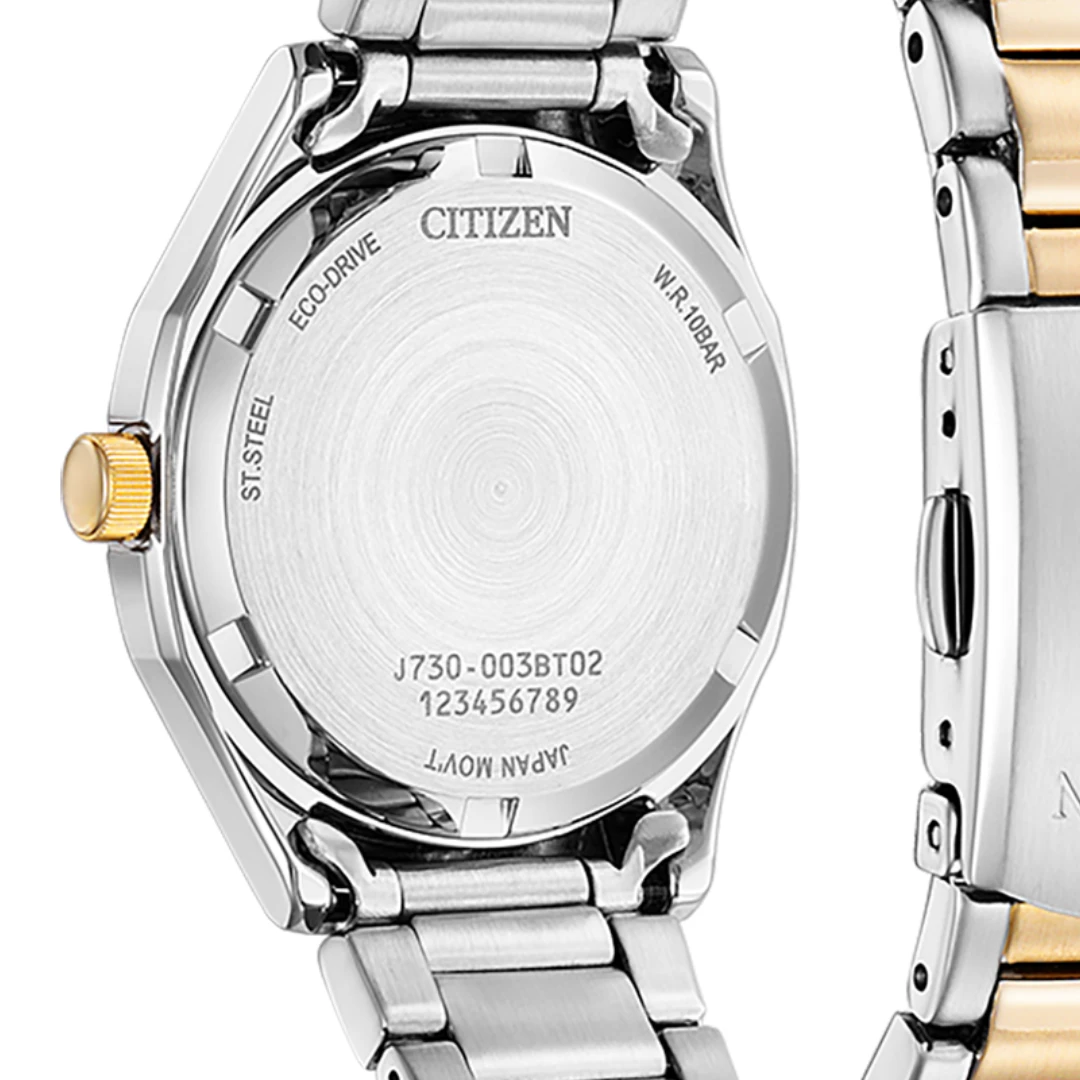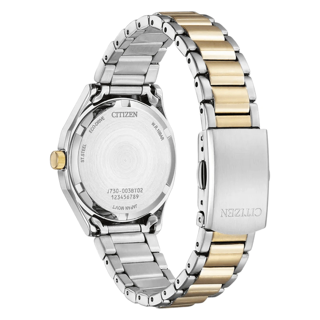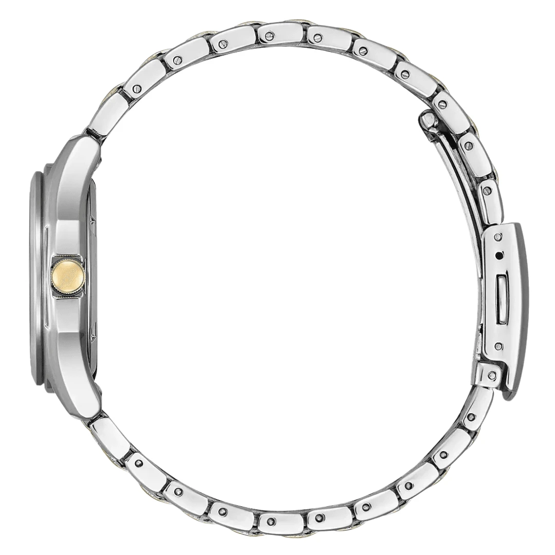 A 31mm two-tone stainless steel case and bracelet makes this timepiece perfect for work, play and everything in between. Water resistance to 100 metres. Sustainably powered by Citizen Eco-Drive technology