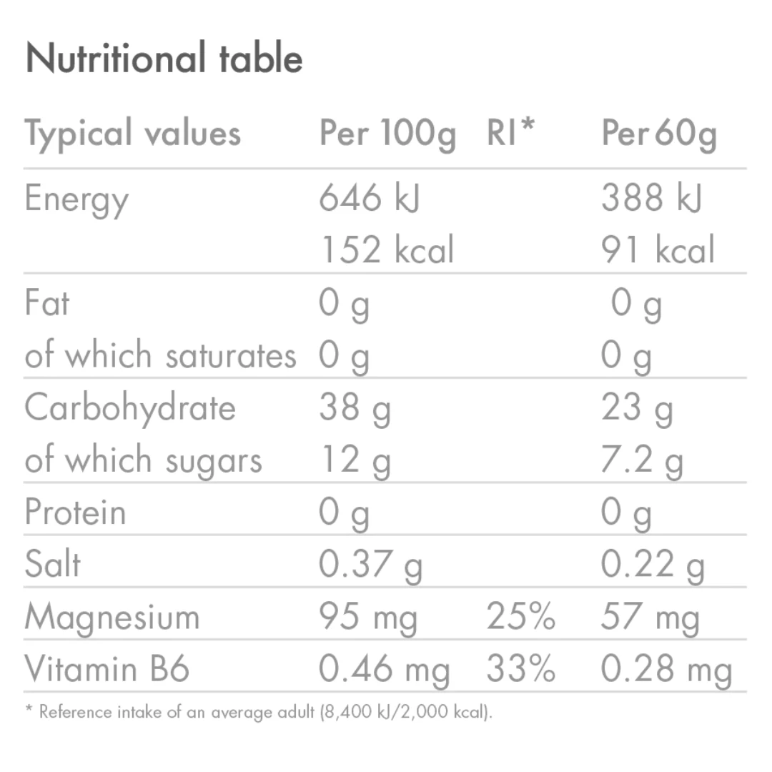 Consume as part of a varied and balanced diet and a healthy lifestyle. Magnesium contributes to electrolyte balance. Vitamin B6 contributes to normal energy-yielding metabolism.