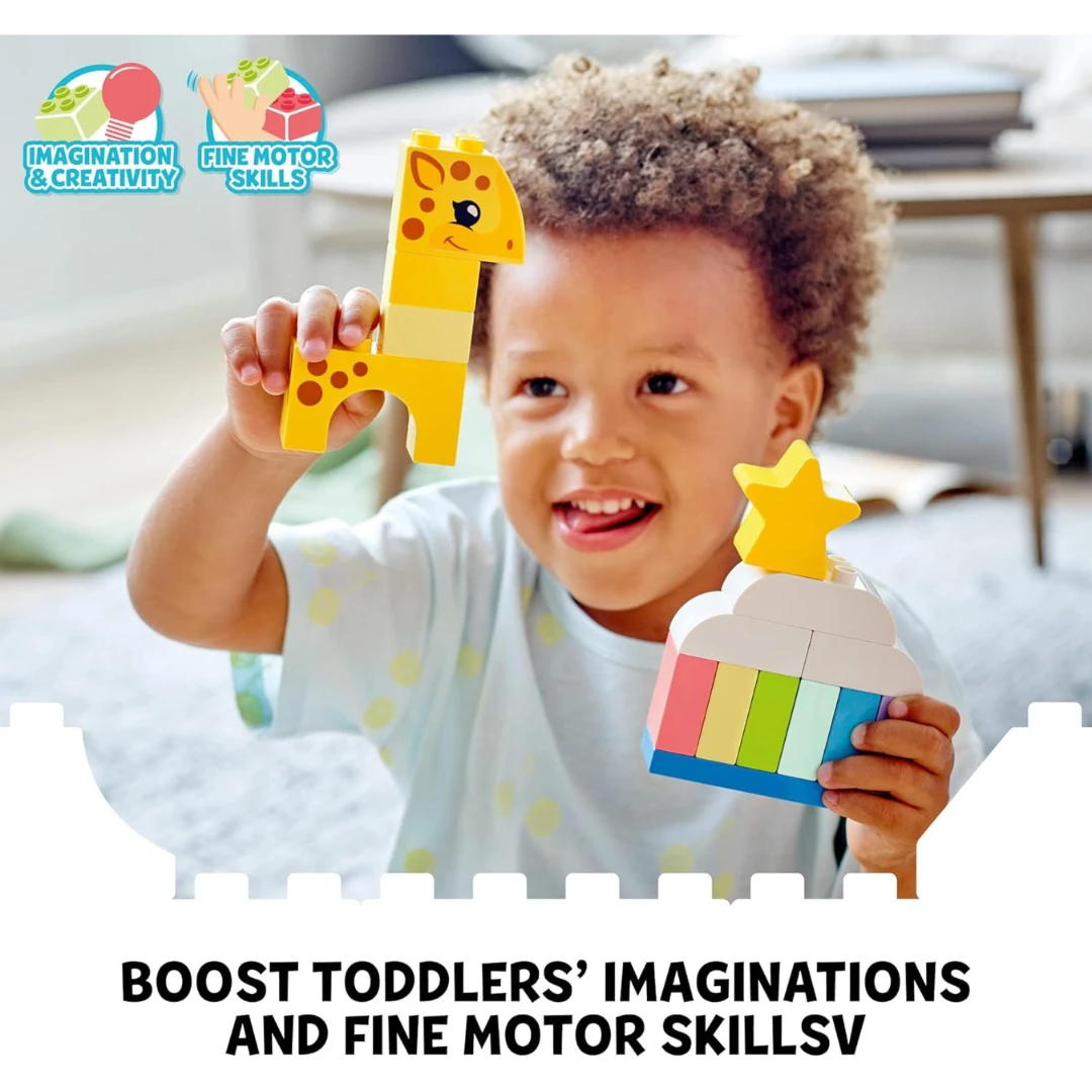 - Toddler-friendly shapes – A colorful assortment of pieces combine to create familiar objects, such as a rocket, star, cake, unicorn, giraffe and a bear, and inspire endless free-building fun.